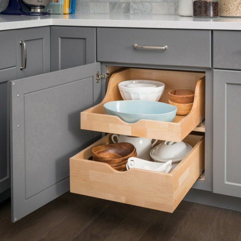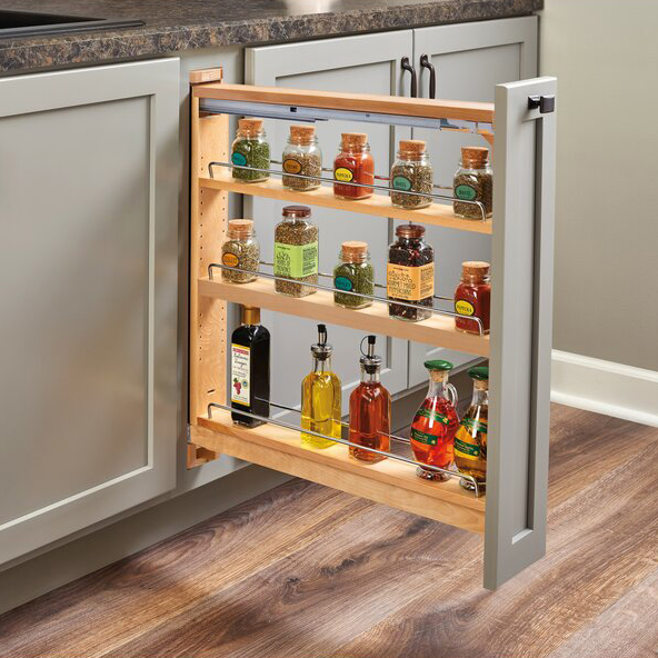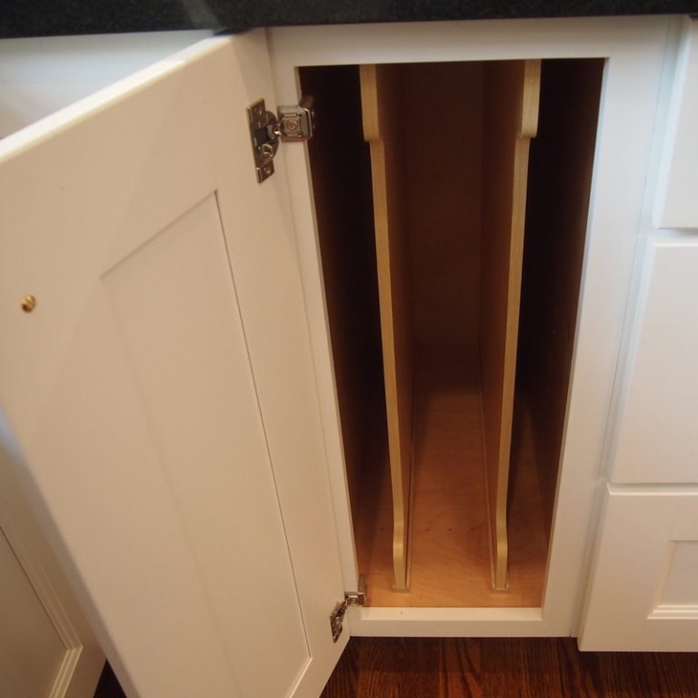 These vertical dividers are often placed in the upper portion of tall cabinetry, such as an oven cabinet, pantry or deep refrigerator upper. They can also be used in narrow base cabinets from 9 to 12 inches wide, where a drawer stack is not practical.