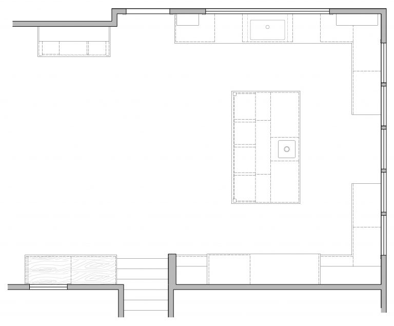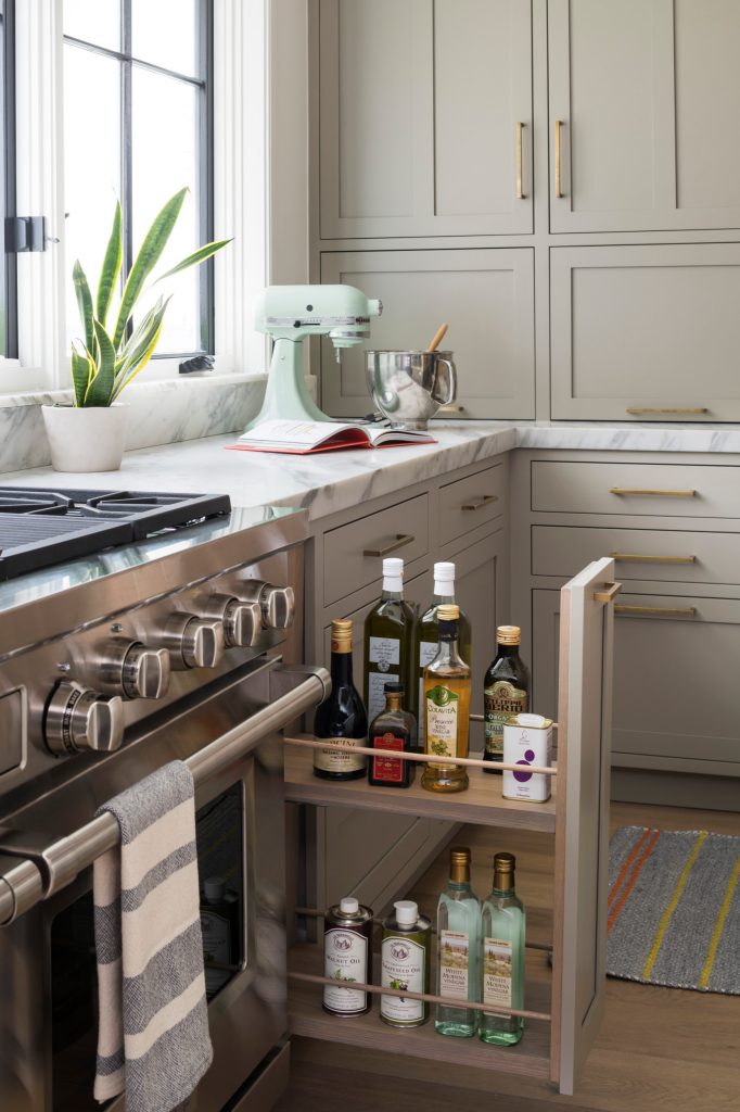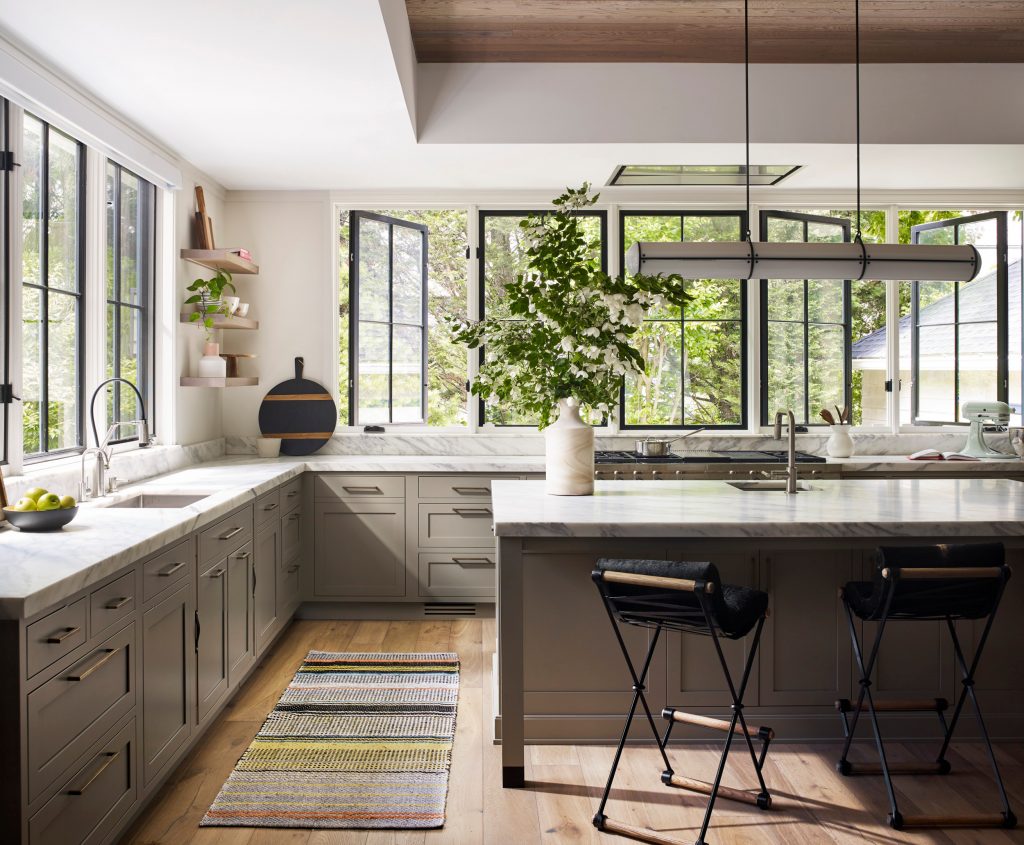 This expansive Victorian had tremendous historic charm but hadn’t seen a kitchen renovation since the 1950s. The homeowners wanted to take advantage of their views of the backyard and raised the roof and pushed the kitchen into the back of the house, where expansive windows could allow southern light into the kitchen all day. A warm historic gray/beige was chosen for the cabinetry, which was contrasted with character oak cabinetry on the appliance wall and bar in a modern chevron detail.