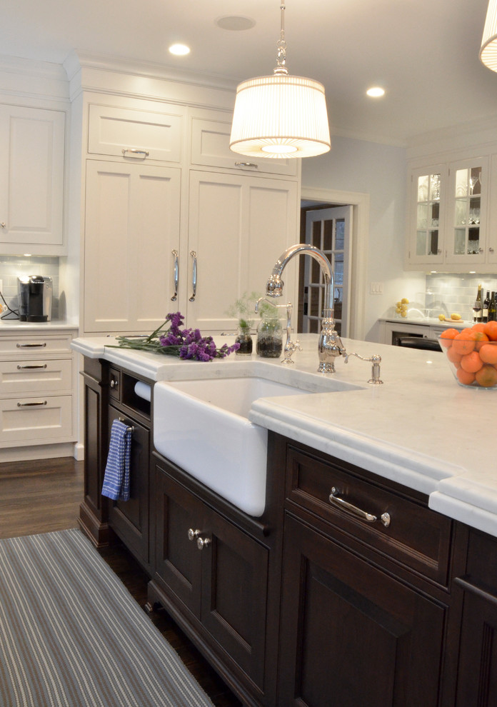 A beautiful colonial revival kitchen underwent a major renovation resulting in a bright and spacious new kitchen and family room area. Cabinets are painted maple beaded inset door with custom profile, and island in cherry with custom espresso stain.